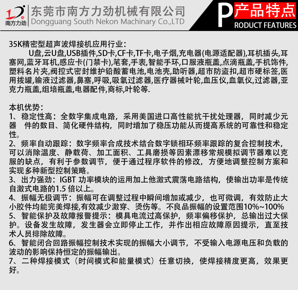 南方力勁機械有限公司是一家大型的超聲波設備研發、生產及銷售企業,公司塑焊機事業部從事生產標準塑焊機,2600W-3200W塑焊機,4200W-5200W塑焊機等大功率焊接設備;15K、20K、28k、40K等精密型焊接設備,還有非標塑焊機設備雙頭塑焊機四頭塑焊機、六頭塑焊機中空板膠框焊接機護欄管焊接機熱板機旋轉式熔接機汽車門板焊接機汽車儀表盤焊接汽車遮陽板焊接機汽車燈焊接機汽車保險杠焊接機等,同時為客戶設計非標自動化塑膠焊接設備