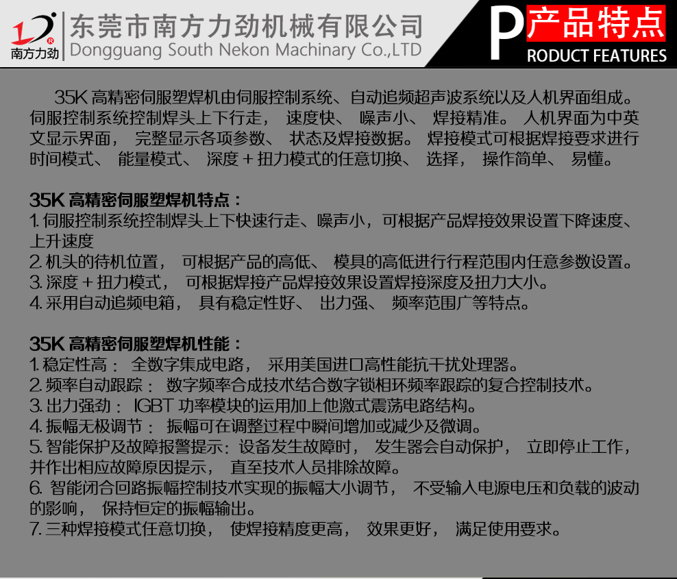 本機(jī)由伺服控制系統(tǒng)、自動(dòng)追頻超聲波系統(tǒng)以及人機(jī)界面組成。伺服控制系統(tǒng)控制焊頭上下行走,速度快、噪聲小、焊接精準(zhǔn)。人機(jī)界面為中英文顯示界面,完整顯示各項(xiàng)參數(shù)、狀態(tài)及焊接數(shù)據(jù)。焊接模式可根據(jù)焊接要求進(jìn)行時(shí)間模式、能量模式、深度+扭力模式的任意切換、選擇,操作簡(jiǎn)單、易懂。