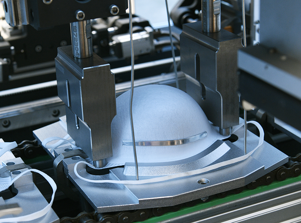 超聲波單頭點焊機鋁制鼻梁條自動切斷、貼合:  單色移印功能: 焊接頭套式松緊帶: 呼吸閥孔開孔: 超聲波焊接呼吸閥: